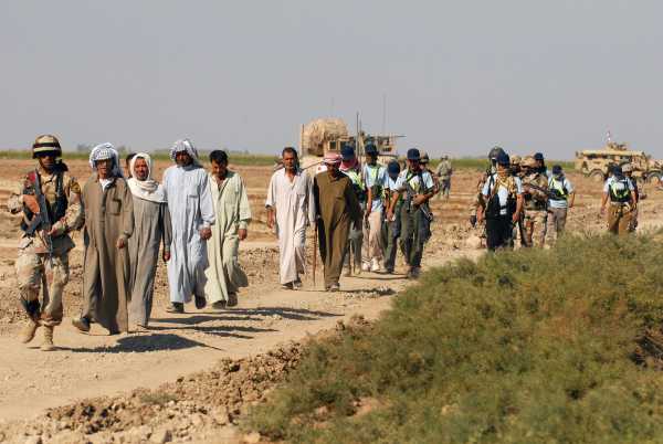 Iraakse militairen en een burgermilitie leiden een groep mannen uit een dorp in de zuidelijke provincie Diyala weg om hen te ondervragen over mogelijke banden met Al-Qaida (2007). Foto US Army. P. Lair