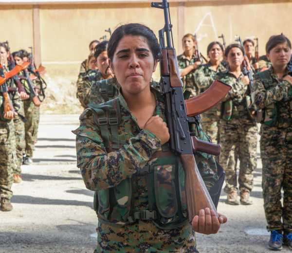 Vrijwilligers van de door de VS gesteunde ‘Syrian Democratic Forces’, die betrokken zijn bij de strijd tegen IS in Raqqa, staan in formatie (augustus 2017). Foto US Army, M. Ryan