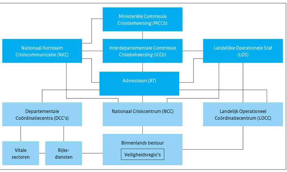 De bestuurlijke zuil loopt van de veiligheidsregio, via het Nationaal Crisis Centrum (NCC) en het Adviesteam naar de Interdepartementale Commissie Crisisbeheersing (ICCb) op hoogambtelijk niveau of de Ministeriële Commissie Crisisbeheersing (MCCb) op politiek niveau (beide commissies worden alleen bij een crisis geactiveerd). Het NCC en het Adviesteam spelen hierbinnen een cruciale rol. Het NCC is een permanent bezet centrum dat fungeert als interdepartementaal coördinatiecentrum.[29] In het Adviesteam worden de operationele adviezen en dilemma’s (afkomstig van het LOCC of LOS), het advies voor de communicatie en het bestuurlijke advies in samenhang beoordeeld en als geïntegreerd advies aan de ICCb of MCCb ter besluitvorming voorgelegd. De keuze om de besluitvorming in de ICCb of in de MCCb af te doen en de samenstelling van beide commissies is afhankelijk van de aard van de crisis.[30] De MCCb is een ministeriële commissie met dezelfde werkwijze als een onderraad van de Ministerraad (art. 25 RvO MR). De commissie staat onder voorzitterschap van de minister van V&J, tenzij de minister-president beslist zelf het voorzitterschap op zich te nemen. De commissie neemt geen bevoegdheden van een minister over en neemt ook geen besluiten over aangelegenheden op het beleidsterrein van een niet-aanwezige minister. Oftewel, de commissie heeft géén doorzettingsmacht: besluitvorming kan alleen bij aanwezigheid van de betreffende minister(s) plaatsvinden. Natuurlijk zijn er situaties denkbaar waarbij besluitvorming niet kan wachten op het bijeenkomen van de betreffende ministers. Hierbij moet gedacht worden aan maatregelen ter voorkoming van een terroristisch misdrijf waarbij snel handelen noodzakelijk is. In deze terreurbestrijdingskwesties beschikt de Minister van V&J wel over de gewenste doorzettingsmacht.[31]