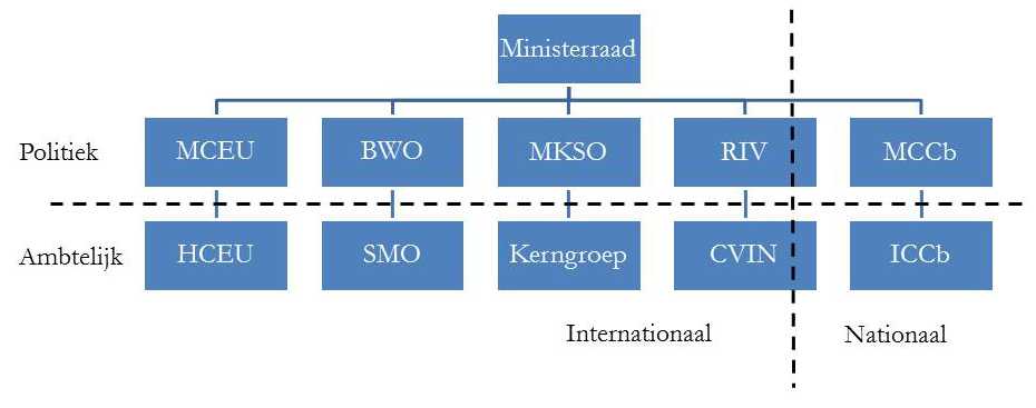 [35] Tot aan het kabinet Rutte-I kende de ministerraad als ambtelijke voorportalen de Raad voor Internationale en Europese Aangelegenheden (RIEA) met de Coördinatieraad Internationale Aangelegenheden (CoRIA) en de Coördinatie Commissie voor Europese Integratie- en Associatieproblemen op Hoogambtelijk niveau (CoCoHan). Met de komst van het kabinet Rutte-I is het stelsel van onderraden herzien, waarbij de RIEA is omgezet in een MCEU. Voor de coördinatie met betrekking tot internationale aangelegenheden is niet langer in een onderraad voorzien.
