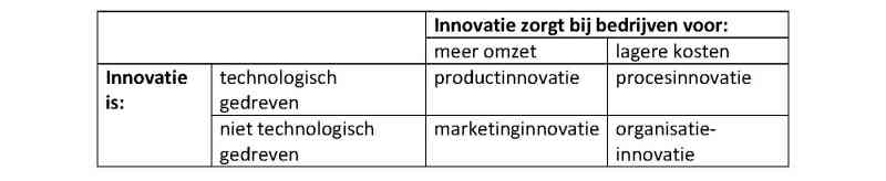 Sinds enkele jaren worden nog twee andere vormen van innovatie onderkend.[7] De eerste is marketinginnovatie. Dit is een bewuste strategie om een nieuwe groep van klanten aan te boren door hen een daarop toegesneden product, qua vorm, functie of verpakking, aan te bieden. De tweede vorm is organisatie-innovatie. Dit is een nieuwe manier om de interne organisatie van een bedrijf zo vorm te geven dat deze tot lagere kosten leidt. Deze twee nieuwe vormen zijn niet technologisch gedreven. Tabel 1 geeft het bovenstaande schematisch weer.