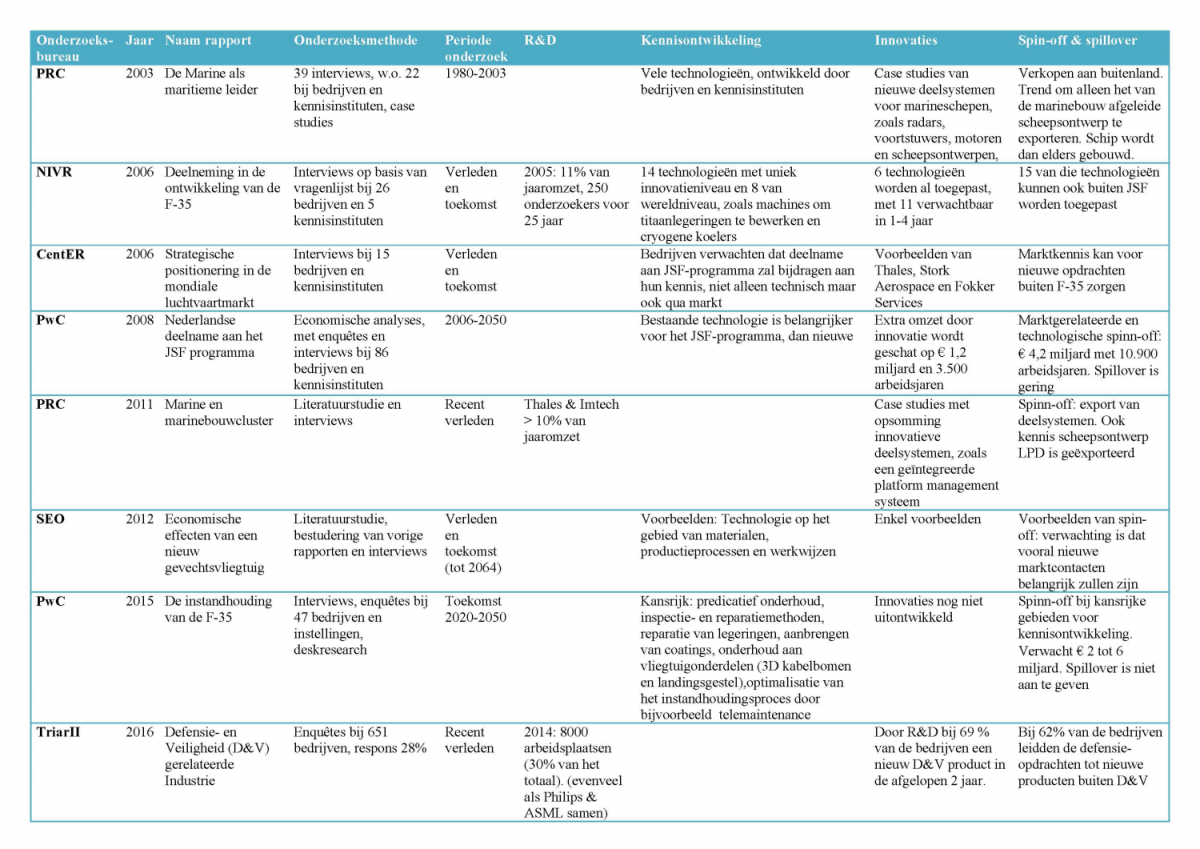 In Nederland zijn de afgelopen jaren verschillende onderzoeken uitgevoerd naar industriële vernieuwing op militair gebied. Deze onderzoekingen hadden tot doel het nut van militaire productie aan te tonen. Dit nut had betrekking op een cluster (de gehele industriële defensiesector of de marine) of op het jachtvliegtuig F-35. Wij hebben die onderzoeken bestudeerd (zie tabel 2).