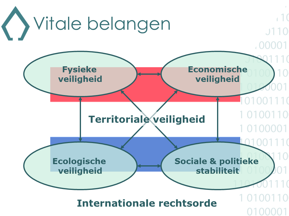 In combinatie met de Internationale Veiligheidsstrategie uit 2013,[23] die naast territoriale en economische veiligheid ook de internationale rechtsorde als een Nederlands vitaal belang aanmerkt, levert dit zes vitale belangen op (zie figuur 1).[24]