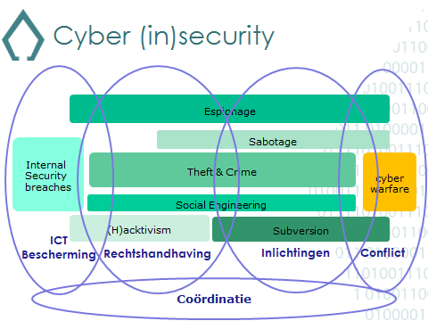 Digitale onveiligheid is een extreem heterogeen begrip. Bedreigingen verschillen qua aard en/of intentie. Digitale onveiligheid betreft (een combinatie van) ideologische, criminele, financiële, politieke, economische en militaire inbreuken.[18] Daarachter gaan zowel statelijke als niet-statelijke actoren schuil. Die laatste categorie omvat onder meer (combinaties van) criminelen, activisten, actiegroepen, terroristen, rebellen én commerciële bedrijven.