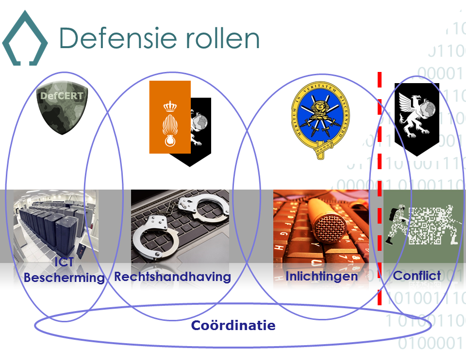 De – in totaal – vier cyber security paradigma’s waaraan defensie bijdraagt, resulteren in vier onderscheidende cyberrollen binnen defensie.[63] De rollen kennen elk hun eigen juridische en bestuurlijke raamwerk, zijn veelal ondergebracht bij verschillende defensieonderdelen, en kennen hun eigen taken, bevoegdheden en verantwoordingslijnen.