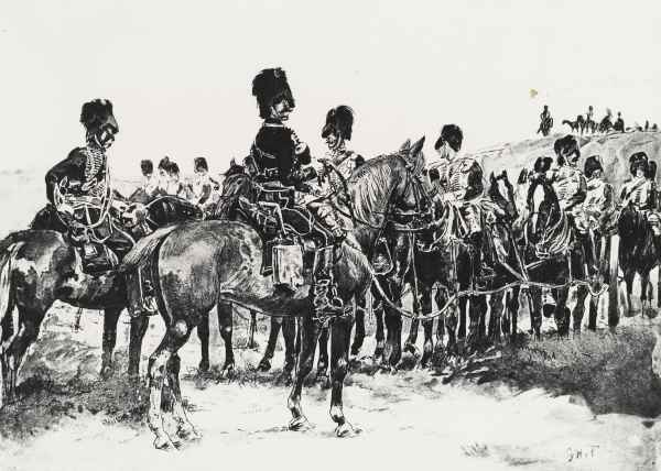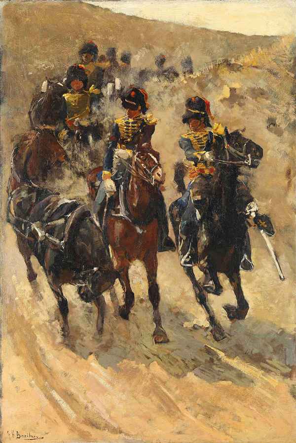 De dynamiek van de paarden en het mooie uniform waren voor veel schilders aanleiding om de rijders te vereeuwigen. Vervaardiger J. Hoynck van Papendrecht. Foto Beeldbank NIMH