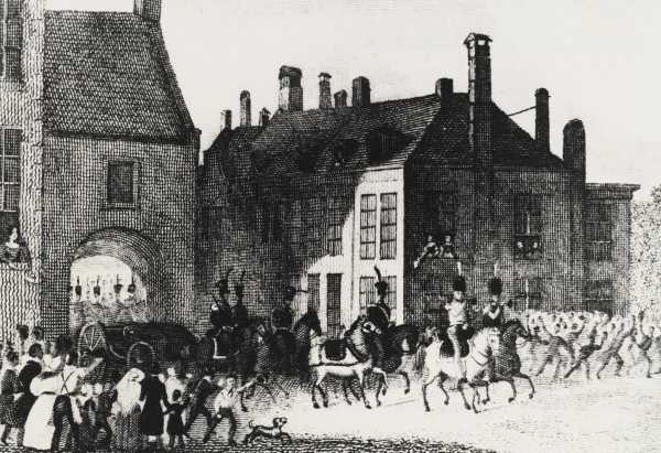 Tijdens de Tiendaagse Veldtocht op de Belgen veroverde stukken worden door de Gevangenpoort Den Haag binnengebracht (gravure), 1831. Foto Beeldbank NIMH