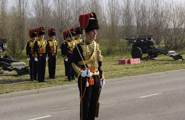 Het Korps Rijdende Artillerie staat bekend om het jasje van het ceremoniële tenue, de dolman. De saluutbatterij van het Korps ‘Gele Rijders’ in ceremonieel tenue tijdens de bijzetting van H.K.H. prinses Juliana. De commandant draagt de ‘gouden’ dolman. Foto Sectie Communicatie Landmachtstaf