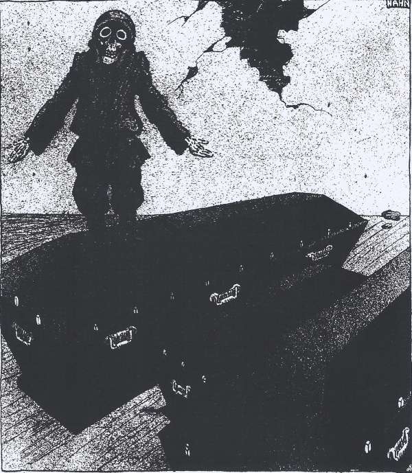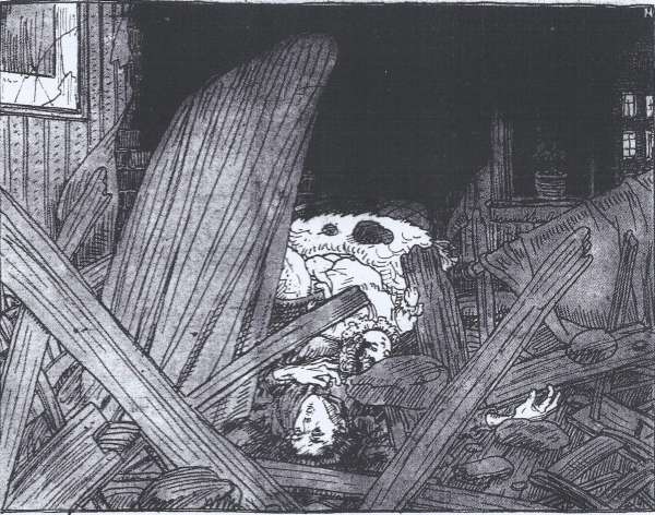 In zijn tekening Oorlogsjammer, met als ondertitel Na het Zeppelinbezoek, kritiseerde de antimilitarist Albert Hahn het bombarderen van burgerdoelen. Bron: De Notenkraker