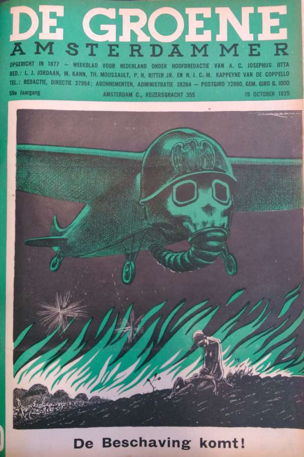 Hoewel pacifisten en communisten met veel aplomb voorspelden dat de toekomstige oorlog zich zou laten kenmerken door grootschalige gasbombardementen, ontbraken tot de Tweede Italiaans-Abessijnse Oorlog (1935-1936) voorbeelden van dergelijke bombardementen in de Nederlandse berichtgeving. In januari 1936 werden berichten verspreid hoe Italiaanse bommenwerpers gifgas- en brandbommen afwierpen op de weerloze burgerbevolking van Abessinië.[48] De prent van Leo Jordaan, die op 19 oktober 1935 groot werd afgedrukt op de omslag van De Groene Amsterdammer, maakt in één oogopslag duidelijk hoezeer de bommenwerper en het gifgas met elkaar verbonden werden.[49] ‘De beschaving komt’ toont op de voorgrond een vrouw met een stervend kind in haar armen. Op de achtergrond staat Abessinië in brand. De overvliegende bommenwerper belichaamt de dood: hij heeft een schedel en draagt een gasmasker en een Italiaanse helm. De Tweede Italiaans-Abessijnse Oorlog leek het definitieve bewijs dat de moderne oorlog een gecombineerde lucht- en gasoorlog was.