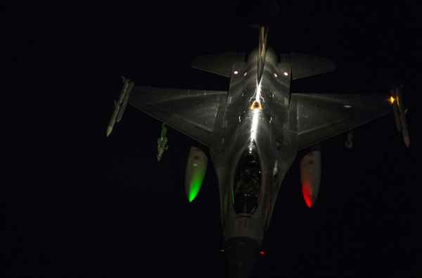 Een Nederlandse F-16 wordt in de lucht bijgetankt door een Amerikaanse KC-135 Stratotanker tijdens Operation Inherent Resolve tegen IS, Irak, maart 2015. Foto US Air Force, P. Aston