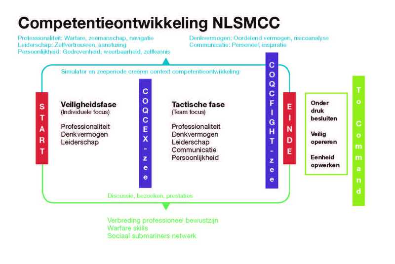 Figuur 2 geeft schematisch weer hoe de competentieontwikkeling is belegd binnen de NLSMCC. De einddoelstelling is het eerder geschetste ideaalbeeld van een onderzeebootcommandant. In grote lijnen betekent dit dat de student: