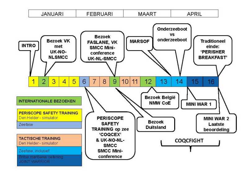 De NLSMCC duurt in totaal vier maanden en is opgedeeld in een veiligheidsfase en een tactische fase. Beide fases bestaan uit een periode in de onderzeebootsimulator in Den Helder en een zeefas (zie figuur 3).