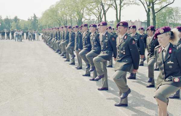 De eerste baretuitreiking in 1992 met onder meer de eerste vrouwelijke Rode Baret, sergeant der eerste klasse Claudy Madorf-Bimbergen en majoor Marc van Uhm (later Commandant Luchtmobiele Brigade en Plaatsvervangend Commandant Landstrijdkrachten). Foto Sectie Communicatie 11 LMB