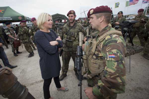 Rode Baretten in gesprek met minister van Defensie Hennis na de uitvoering van de oefening Noble Jump (2015), de eerste grote internationale testoefening van de NAVO Flitsmacht (Very High Readiness Joint Task Force) in Polen: Foto MCD, E-J Daniels