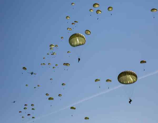 Inzet van Rode Baretten met parachute tijdens de jaarlijkse Joint Operational Access Exercise (JOAX) van 82 (US) Airborne Division (2015). Foto Bundeswehr, M. Dorow