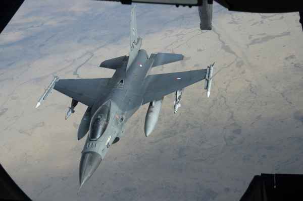 De Nederlandse F-16’s voeren onder meer Armed Overwatch-missies uit, die vijf tot zes uur kunnen duren en bijtanken in de lucht noodzakelijk maken. Foto De Vliegende Hollander