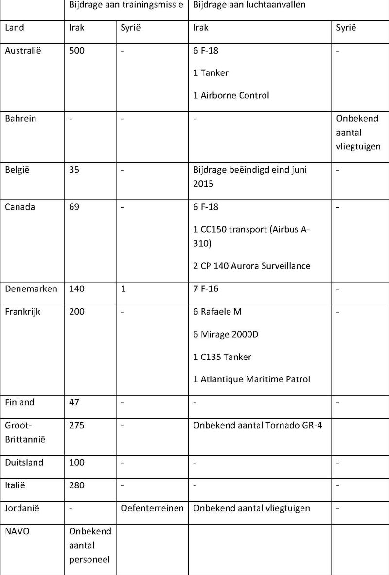 Overzicht deelnemende landen Operation Inherent Resolve per augustus 2015 Bron: Kathleen J. McInnis, ‘Coalition Contributions to Countering the Islamic State’ (Washington, D.C., Congressional Research Service, 2015)