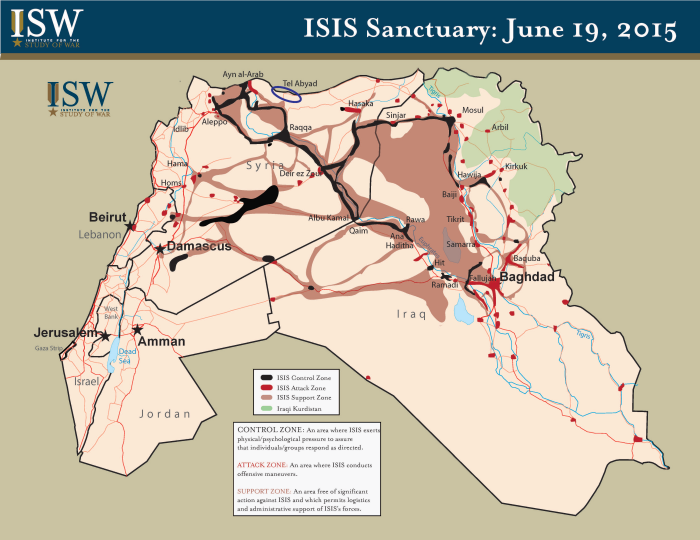 Het effect van de luchtaanvallen van de internationale coalitie op het grondgebied van ISIS in Irak en Syrië. Bron: Institute for the Study of War