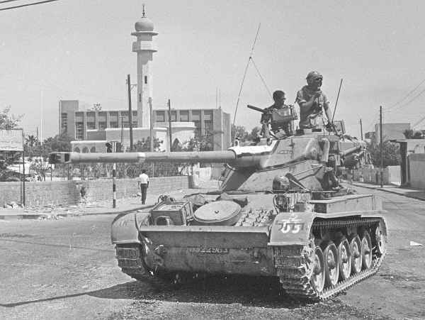 Een Israëlische tank in de buurt van een moskee, juni 1967: op zoek naar antwoorden voor de conventionele overmacht van het Warschaupact bestudeerden Amerikaanse krijgskundigen lessen van de Israëlische strijdkrachten. Foto ANP