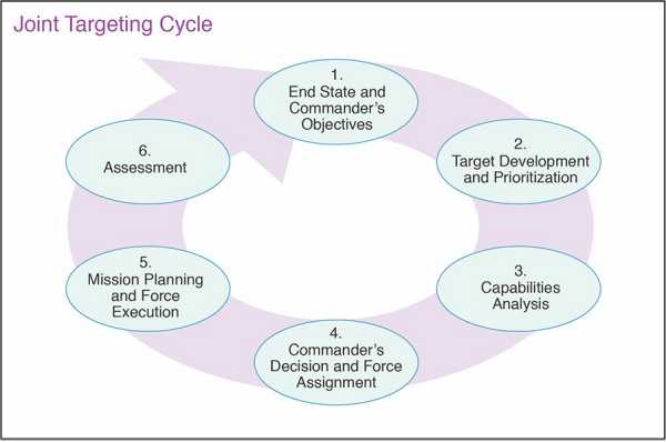 De NAVO omschrijft het targeting proces als volgt: “Joint targeting is the process of determining the effects necessary to achieve the commander’s objectives, identifying the actions necessary to create the desired effects based on means available, selecting and prioritizing targets, and the synchronization of fires with other military capabilities and then assessing their cumulative effectiveness and taking remedial action if necessary.”[35] De NAVO brengt deze cyclus illustratief in beeld met zes stappen, beginnend met het vaststellen van het oogmerk van de commandant en eindigend met een evaluatie om vooruitgang van de missie te meten en vervolgstappen te identificeren. Deze stappen zijn ruwweg onder te verdelen in drie fasen: (1) planning, (2) uitvoering en (3) evaluatie.[36] Kortom, het is van belang dat targeting niet wordt gezien als een losstaande activiteit of functie maar als een geheel aan (deel)activiteiten en functies welke binnen een nauwkeurig gepland en gecontroleerd proces wordt uitgevoerd.