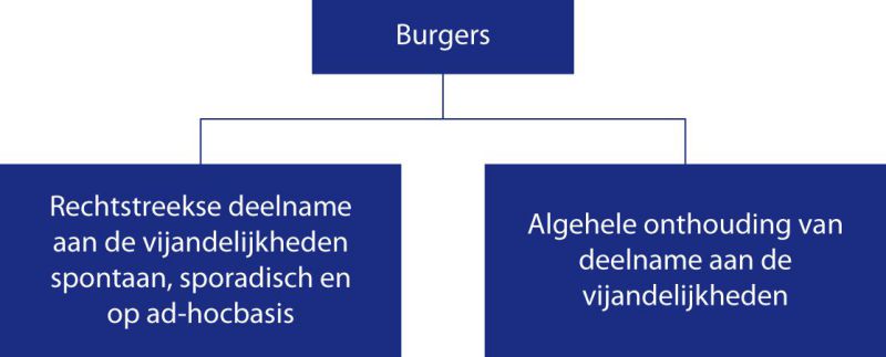Tot slot kunnen burgers weer worden onderverdeeld in twee groepen. Burgers verliezen de bescherming van het HOR wanneer en zolang zij rechtstreeks deelnemen aan de vijandelijkheden, maar behouden daarbij de status van burger. Het sporadische element in deze directe deelname speelt daarin een centrale rol.[16] Aan de andere kant staan die burgers die zich geheel onthouden van inmenging in de vijandelijkheden en dus altijd bescherming genieten tegen directe aanvallen.