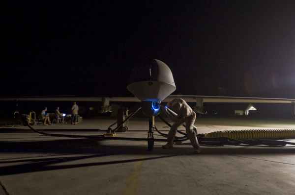 Pre-flight inspectie van een bewapende Amerikaanse MQ-1B Predator UAV voor gebruik tegen ‘critical and perishable targets’ in de Global War on Terrorism. De legitimiteit van de inzet van ‘bewapende drones’ is onderwerp van debat.Foto US Air Force