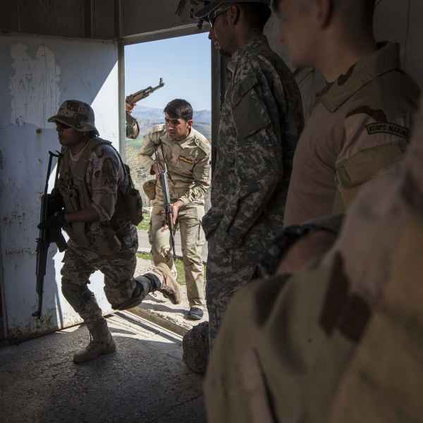 Mariniers verzorgen een Basic Infantry Skills Course voor Peshmarga’s in Noord-Irak (2015). Militairen moeten zich ervan bewust zijn dat tegenstanders er uit kunnen zien als beschermde burgers en zich onder de bevolking verschuilen. Foto MCD, S. Hilckmann