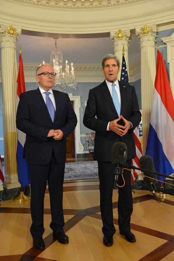 Toenmalig minister van Buitenlandse Zaken Frans Timmermans (links) tijdens een bilaterale bijeenkomst in de VS, september 2013. Timmermans verzocht de Commissie van Advies inzake Volkenrechtelijke Vraagstukken een advies uit  te brengen over de legitimiteit van de inzet van ‘bewapende drones’. Foto US Department of State