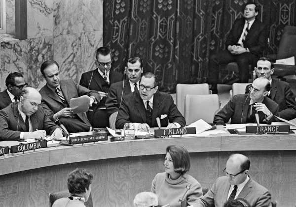 De VN-Veiligheidsraad debatteert over maatregelen tegen Zuid-Rhodesië (1970): de opeenvolgende VN-sancties leidden in Nederland tot wetgevingsproblemen. Foto VN