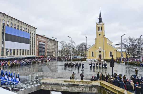 Tallinn, Estland, 2014. Estse militairen vieren samen met NAVO-bondgenoten uit onder meer België, Polen, het VK en de VS de Estse onafhankelijkheid. Foto US Army, A.M. Colin