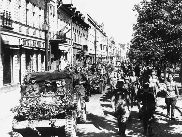 Intocht van het Rode Leger in Kaunas, Litouwen, 1944. De Baltische staten waren een speelbal tussen de Duitse bezetter en het oprukkende Rode Leger. Foto ANP