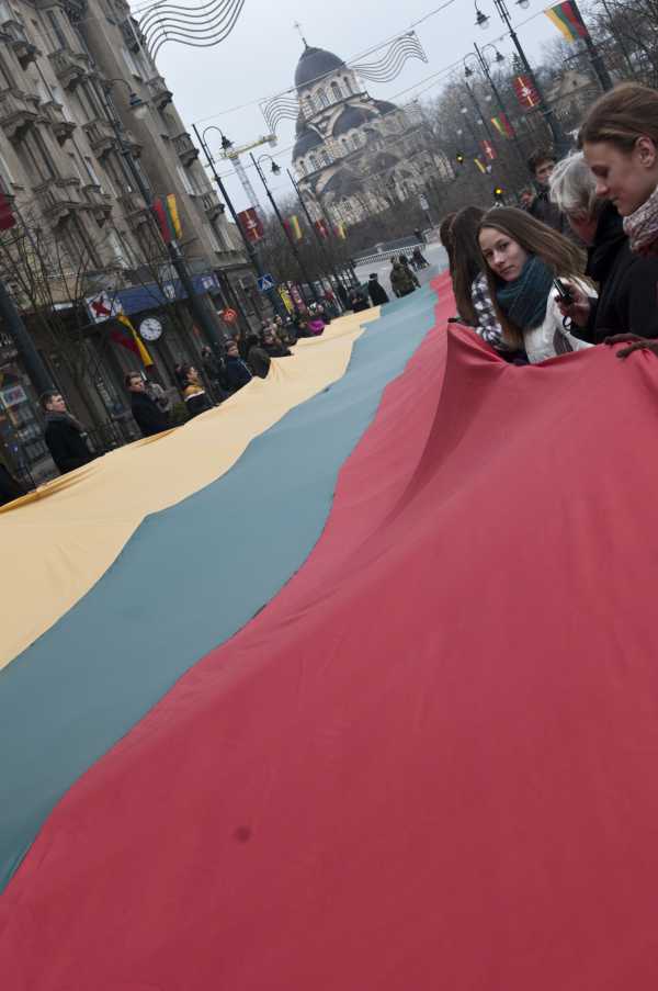 Litouwse burgers en militairen dragen een 200 meter lange Litouwse vlag ter ere van de onafhankelijkheid van Litouwen, Vilnius, 2015. Foto US Army, M. Leuck
