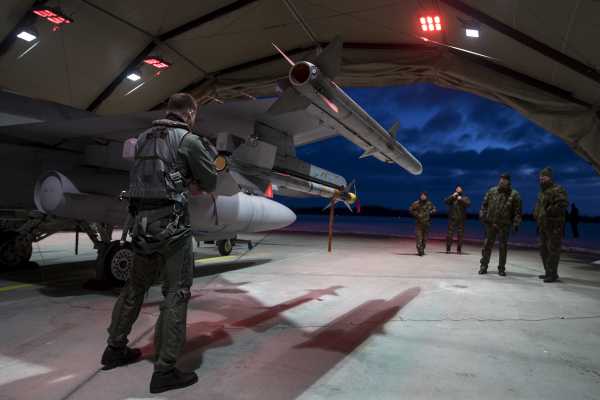 Nederland levert vier F-16’s ter verdediging van het luchtruim boven de Baltische staten. Een vlieger controleert de bewapening van zijn F-16, januari 2017. Foto MCD, G. van ES