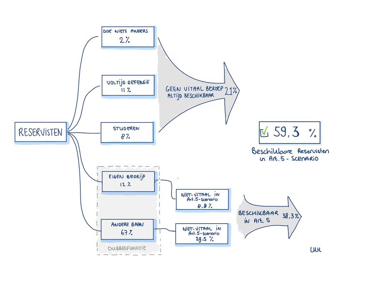 Om in te kunnen spelen op de toenemende dreiging en kans op een Artikel 5-scenario, is een schaalbare defensieorganisatie nodig en daarbij spelen reservisten een essentiële rol. De beschikbaarheid van reservisten vormt echter een probleem, dat onder andere voortkomt uit de mogelijke dubbelfuncties die zij bekleden. Het is mogelijk dat reservisten in hun primaire baan een vitaal beroep uitoefenen, terwijl ze ook als reservist een vitale bijdrage leveren voor Nederland. Uit dit onderzoek blijkt dat in totaal 59,3 procent van het reservistenbestand van Defensie beschikbaar is in het geval van een Artikel 5-situatie. Uitgesplitst van het totale bestand heeft 21 procent geen dubbelfunctie, 29,5 procent heeft een andere baan maar niet in een vitale sector en 8,8 procent heeft een eigen bedrijf buiten een vitale sector. Defensie zal geen beroep kunnen doen op de overige 40,7 procent. Mochten extra sectoren (zoals onderwijs) ook als cruciaal worden bestempeld, dan kan de beschikbaarheid van reservisten nog verder afnemen tot slechts 44 procent.