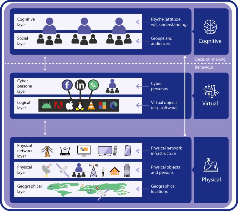 De cognitieve dimensie is waar mensen gedachten en ideeën vormen en besluiten nemen. Dit vindt plaats in een sociale omgeving die deze gedachten en ideeën beïnvloedt. Denk hierbij aan psychologische en sociologische processen en cultuur. De virtuele dimensie is de digitale ruimte waar doelgroepen met elkaar communiceren en informatie uitwisselen. Dit omvat onder andere software, sociale media en andere digitale kanalen, maar ook de virtuele verpersoonlijking van de gebruikers. De fysieke dimensie omvat de geografische locaties waar mensen en middelen zich bevinden, evenals de infrastructuur en fysieke objecten die daarbij horen.[19] Dit is ook de dimensie waar fysieke gevechten plaatsvinden. De fysieke dimensie is tastbaar in de fysieke wereld, de virtuele en de cognitieve dimensie niet.