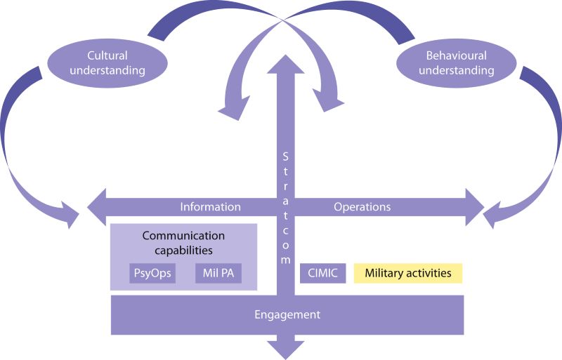 Binnen de NAVO is StratCom verantwoordelijk voor het bedenken, plannen en uitvoeren van alle NAVO-activiteiten vanuit het besef dat informeren en het beïnvloeden van de perceptie, houding en gedrag van doelgroepen essentieel is.[24] StratCom richt zich op de verticale afstemming van narratieven en informatieactiviteiten, zodat eenheden op verschillende niveaus in de organisatie (strategisch, operationeel en tactisch) in samenhang werken aan gemeenschappelijke doelen. Info Ops richt zich op de horizontale afstemming van de informatieactiviteiten en narratieven. Horizontaal betekent hier binnen hetzelfde niveau, bijvoorbeeld een brigade(staf). Info Ops coördineert militaire informatieactiviteiten (inclusief kinetische acties), zodat deze elkaar versterken en het maximale effect bereiken. Binnen StratCom zijn PsyOps en MilPA de communicatiecapaciteiten waarvan Info Ops de activiteiten direct aanstuurt. Daarnaast omvat Info Ops ook het afstemmen van andere activiteiten, zoals die van CIMIC en acties van gevechtseenheden. Engagement is een militaire activiteit die zowel C&E-personeel als niet C&E-personeel kan uitvoeren. In het laatste geval heeft C&E een ondersteunende rol. Specialistisch personeel en analisten/onderzoekers op cultureel- en gedragsgebied spelen daarnaast een belangrijke rol. Zij verrichten onderzoek, analyseren en beoordelen deze informatie en adviseren commandanten en ander C&E-personeel.[25]