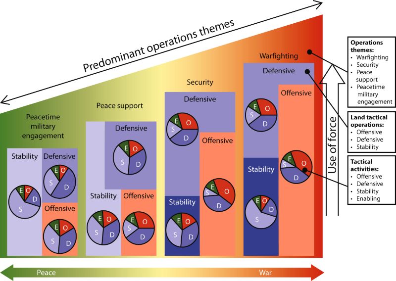 Operaties in het landdomein vinden plaats binnen verschillende operatiethema’s. Die omvatten een bundeling van militaire operaties met een gemeenschappelijk strategisch doel, binnen een specifieke tijd en geografische context.[26] Deze thema’s zijn warfighting, security, peace support en peacetime military engagement. Binnen elk thema vinden tactische operaties plaats, zoals offensieve, defensieve en stabilisatieoperaties. De operaties bestaan weer uit verschillende tactische activiteiten.[27]