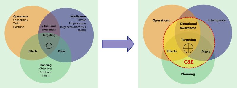 StratCom en Info Ops zijn volgens de doctrine vanaf het begin betrokken bij het planningsproces. Zij helpen bij het definiëren van gewenste effecten en vergroten de kans op succes voor het bereiken van deze effecten. Integraliteit is hierbij het sleutelwoord, hoewel dit in de praktijk nog niet altijd volledig is geborgd. Dit komt onder andere door verzuiling tussen diverse vakgebieden en specialismen. In de volgende secties bespreken wij de rol van C&E binnen het inlichtingenproces en targeting.