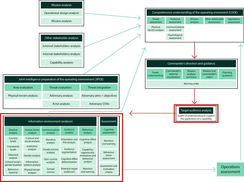 Figuur 5 maakt zichtbaar hoe de diverse processen en producten zich tot elkaar verhouden en gezamenlijk leiden tot de CUOE.[36] De producten die Info Ops bijdraagt zijn rood omkaderd aangegeven. CIMIC-analyse en assessment ontbreekt in deze afbeelding doordat de NAVO CIMIC doctrinair niet binnen Info Ops plaatst. Dat neemt niet weg dat CIMIC-producten een substantiële bijdrage leveren aan de CUOE. Voorbeelden van zulke producten zijn het CIMIC Estimate[37] en informatie over Cross-Cutting Topics.[38]