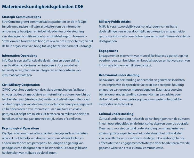 Eind 2020 richtte de Koninklijke Landmacht het ‘Wapen van de Informatiemanoeuvre’ op. Dit Wapen bestaat uit het Korps Inlichtingen & Veiligheid (I&V) en het Korps Communicatie & Engagement (C&E). De naam Communicatie & Engagement leidt weleens tot verwarring. Dit artikel maakt het vakgebied van C&E beter inzichtelijk. Het beschrijft hoe de beschikbare middelen binnen dit vakgebied bijdragen aan de NAVO-strategie en aan de visie en de gevechtskracht van de Nederlandse krijgsmacht. Militaire organisaties moeten verder kijken dan kinetische oorlogsvoering en erkennen hoe belangrijk informatie en gedragsbeïnvloeding bij oorlogvoering zijn.