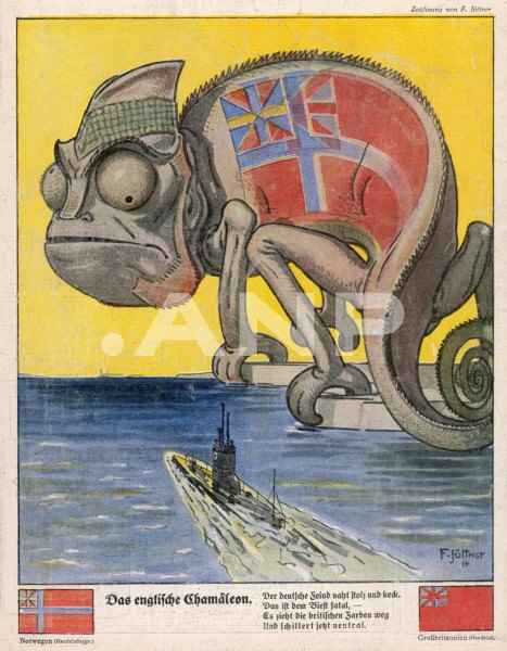 Duitse spotprent uit 1915 op de ‘lafheid’ van de Britse marine om zich achter de bijna identieke Noorse vlag te verschuilen. Clausewitz concludeert dat het hele fenomeen oorlog een ware kameleon is. Foto ANP