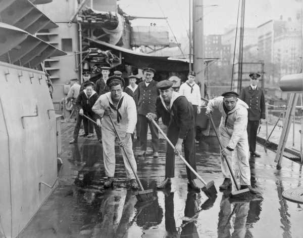 Dekzwabberen aan boord van Hr.Ms. Sumatra in New York, 1926. Militaire geschiedenis kan niet alleen over grote namen en grote daden gaan en dient anno nu een multidisciplinair vakgebied te zijn. Foto Beeldbank NIMH