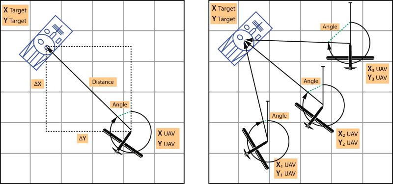 Bij gebruik van UAS als TA zijn er vier inzetmethodes. De eerste methode is met een laser range finder (LRF), die het coördinaat van het doel bepaalt.[27] Een tweede methode is het meten van meerdere hoeken van het doel ten opzichte van de positie van de UAS (zie Figuur 1). Met behulp van trigonometrie wordt vervolgens de locatie van het doel bepaald. Het voordeel van deze methode is dat deze volledig passief is en er snel meerdere doellocaties kunnen worden berekend.[28] Overvliegen van het doel vormt een derde methode, waarbij de positie van de UAS boven het doel wordt overgenomen als doellocatie (zie Figuur 2). Deze methode is het meest opvallend en de nauwkeurigheid hangt af van het navigatiesysteem van de UAS.[29] Een vierde methode is dat de UAS referentiepunten gebruiken om de positie van het doel te bepalen (zie Figuur 3). Voor deze methode is het noodzakelijk dat de UAS-operator kennis heeft van het gebied en de exacte coördinaten van de referentiepunten kent.[30] UAS kunnen relatief eenvoudig ingezet worden voor doelopsporing, vooral wanneer een tegenstander niet over detectiemiddelen beschikt. Deze zijn noodzakelijk voor (tijdige) onderkenning. Een UAS is ’s nachts niet te zien met het blote oog. Overdag is, afhankelijk van de omvang, een UAS op (grote) hoogte ook niet te zien met het blote oog. Ze zijn dan hooguit nog te horen. Optiek, scanners en andere middelen om UAS te detecteren zijn daarom essentieel. Een TA UAS zal niet altijd direct een doel laten aangrijpen. Het gebeurt ook dat een enkel doel, zoals een ambulance, houwitser of logistiek middel, wordt gevolgd om een verzamelgebied, medische of logistieke installatie te vinden, zodat deze (ook) vernietigd kunnen worden.