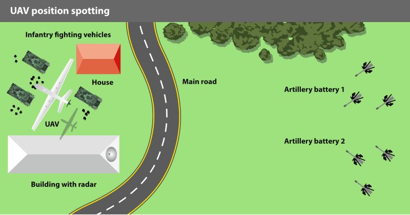 Er wordt veel gebruik gemaakt van UAS, niet alleen voor TA, maar ook voor bijvoorbeeld verkenning of om te dienen als waarschuwend element. Dit leidt er in Oekraïne toe dat er gemiddeld per 10 kilometer tussen de voorste lijn eigen troepen (FLOT) en de forward line enemy troops 25-50 UAS in de lucht hangen, op verschillende hoogtes en voor verschillende doeleinden.[14] UAS kunnen ook EOV-taken, zoals jamming (het opzettelijk storen om het gehele of een gedeelte van een signaal onbegrijpelijk te maken of te vervalsen),[15] uitvoeren om oudere CBF-radars te spoofen (het vervalsen van signalen om de ontvanger te misleiden).[16] De ORLAN-10 kan hiervoor bijvoorbeeld speciaal worden uitgerust met het Shelest-systeem. Dit systeem wordt aangezet zodra de eigen artillerie gaat vuren. Het idee is dat de radar een verkeerd coördinaat geeft van de locatie van de fire units waardoor eventueel CBF het doel mist.