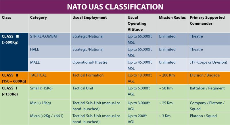 Een UAS bestaat uit één of meer Unmanned Aerial Vehicles (UAV’s), een launch and recovery element, een grondcontrolestation en het datalinksysteem.[5] De NAVO heeft UAS geclassificeerd in de klassen I t/m III (zie Tabel 1).[6] Binnen de NAVO wordt gesproken van UAS. Om verwarring in de terminologie te voorkomen, gebruikt dit artikel de term UAS, zelfs wanneer het specifiek gaat om de UAV(’s) binnen het systeem. Zo blijft consistentie met andere documenten over UAS of C-UAS behouden. De dreiging voor manoeuvre, artillerie, genie, logistiek en geneeskundige eenheden komt voornamelijk van Class I-UAS.