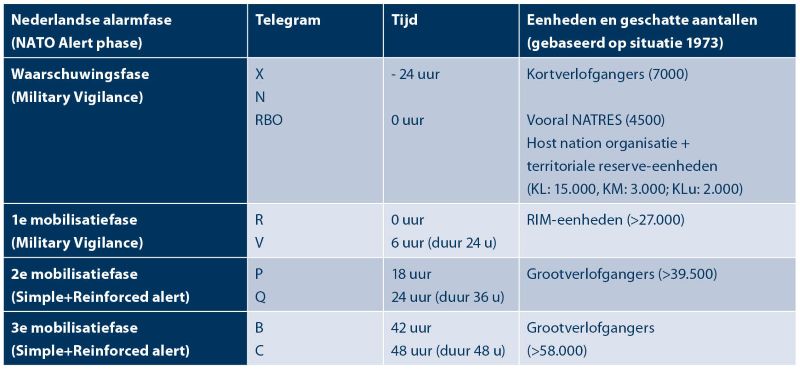Tabel 1 Schematisch overzicht Nederlands mobilisatiesysteem, vooral van de KL, tweede helft Koude Oorlog. Vrij naar: Jan Hoffenaar en Daan Theodorus Sanders, ‘The Cold War ‘life jacket’. The scalable armed forces of the Netherlands: a historical perspective’ , in: Huib Zijderveld e.a. (red.) NL Arms 2025. The Art of Scaling. Organising Swift Adaptation to Cope with Crises and Wars (Leiden, Leiden University Press, 2025) 65-82