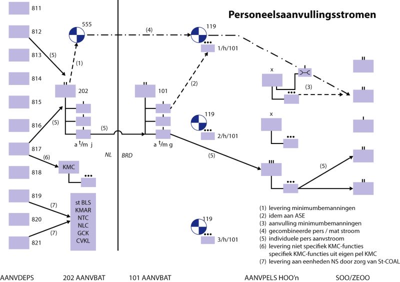 Figuur 7 Schematische weergave uit het archief van doelstelling herziene personeelsaanvullingssysteem, met daarin verwerkt samenwerking met 555 en 119 Parkcie, net als aanvullingslijnen aan diverse andere organisaties als luchtstrijdkrachten (BDL). Reconstructie op basis van: NL-HaNA, 2.13.110, inv.nr.1486, 2e Concept-Eindrapport Werkgroep Personeelsaanvullingssysteem in oorlogstijd met bijlagen uit vorige jaren, december 1979.