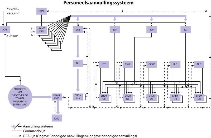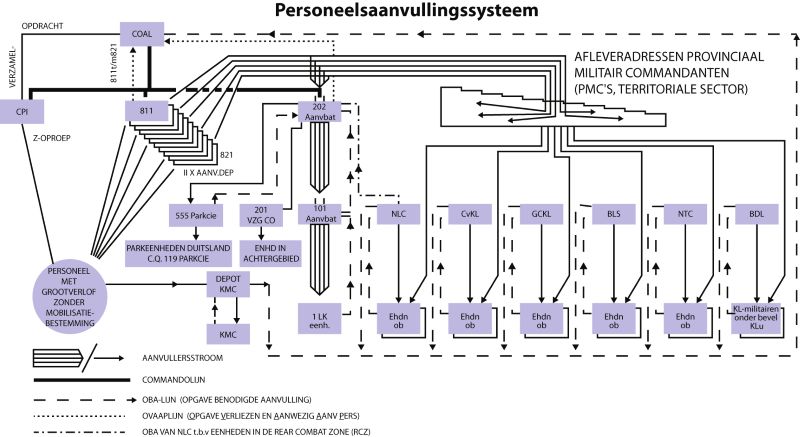 Met deze eenheden werkte het personeelsaanvullingssysteem rond 1980 in essentie als volgt (voor overzicht zie figuur 2): eenheden in het gevecht – vooral bataljons of equivalenten – rapporteerden door middel van een codenummering de ‘aanvullers’ die zij nodig hadden, uitgesplitst naar rang, wapen/dienstvak en bijzonderheden. Deze lijsten met aanvragen werden verzameld door de hogergelegen commandanten en gebundeld – vaak op brigadeniveau – in een ‘Opgave Benodigde Aanvullers’ (OBA) naar 101 Aanvbat gestuurd. 101 Aanvbat had zelf de eerste dagen na de mobilisatie, als genoemd, nauwelijks ‘vooraad’, maar kon ‘leveren’ aan de eenheden zodra de aanvulling vanuit 202 Aanvbat op gang kwam. 202 Aanvbat had vanaf de mobilisatie een ‘voorraad’ van ongeveer 4000 man (genoeg voor circa vijf dagen oorlog). Dat waren mobilisanten die relatief recent hun diensttijd hadden vervuld. 202 Aanvbat diende op zijn beurt weer bij het COAL nieuwe aanvragen en prognoses in, in een ‘Overzicht Verliezen en Aanwezig Aanvullingspersoneel’ (OVAAP). Het COAL verzamelde de aanvragen en prognoses vanuit genoemde 1LK-lijn alsook vanuit de territoriale sector, en gaf de Aanvullingsdepots (811 t/m 821) opdracht aanvullingspersoneel te doen doorstromen naar 202 Aanvbat en de territoriale eenheden. De aanvullingsdepots hadden na mobilisatie personeel ter vulling voor ongeveer tien oorlogsdagen. Dat was ook grotendeels relatief recent afgezwaaid reservepersoneel. Allen die daarna als nieuwe aanvullers werden opgeroepen, kwamen uit het VIB, de groep reservisten zonder mobilisatiebestemming. Dit laatste ging, in samenwerking met de Directie Personeel Koninklijke Landmacht (DPKL) en de territoriale organisatie belast met de mobilisatievoorbereiding, middels een zogenoemde ‘Z-oproep’ aan betrokkenen. De capaciteit van dit systeem in termen van het aantal te vervangen militairen was ongeveer 1000 man per dag voor een maximum van 30 dagen. Het Korps Mobiele Colonnes (KMC), dat belast was met taken ten behoeve van de civiele verdediging en nationale weerbaarheid, had een eigen structuur parallel aan deze eenheden, ook onder het COAL. Het KMC putte ook uit de reservistenvoorraad, natuurlijk vooral reservisten die eerder bij het KMC hadden gediend.[9]