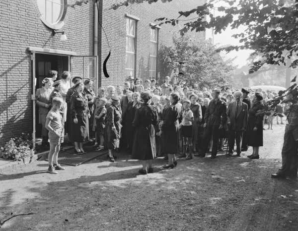 Wachtenden voor een massale voedseluitdeling bij een oefening van de kantinedienst van de BB in Arnhem, september 1955: de fotograaf meldde dat de voorraad andijviestamppot met vlees en spek al snel op was, waardoor velen met een lege maag terug naar huis moesten. Nationaal Archief/Anefo, Harry Pot